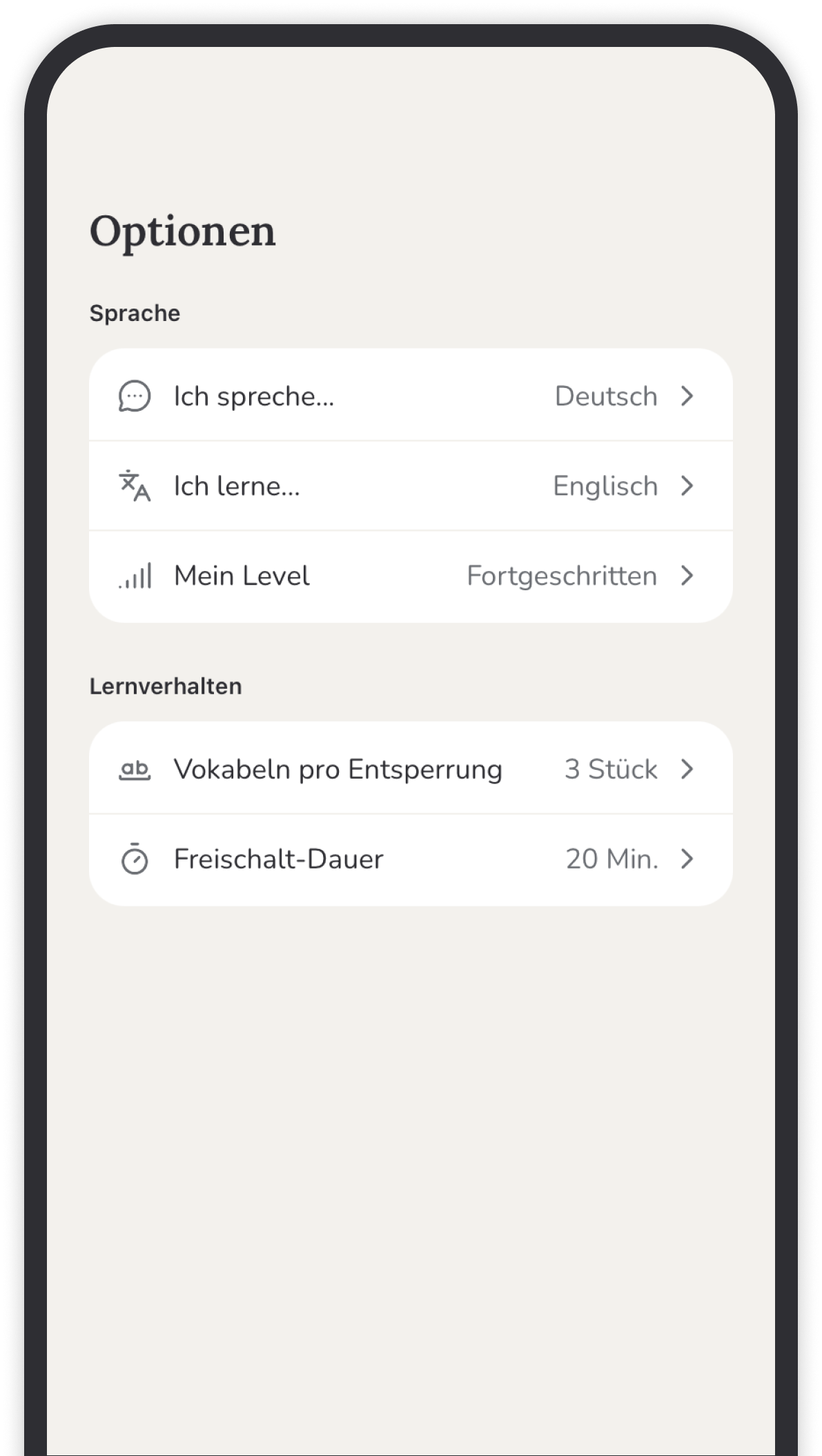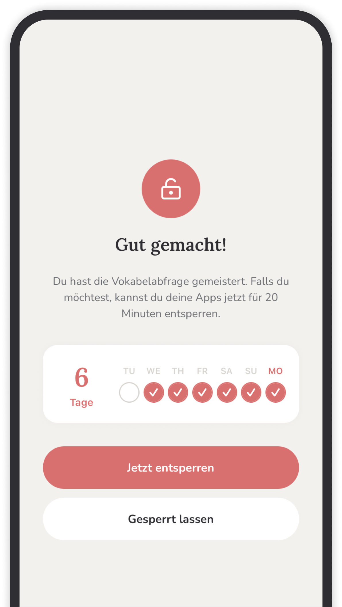 Bevor du eine gesperrte App öffnest, beantwortest du eine kurze Vokabelabfrage.